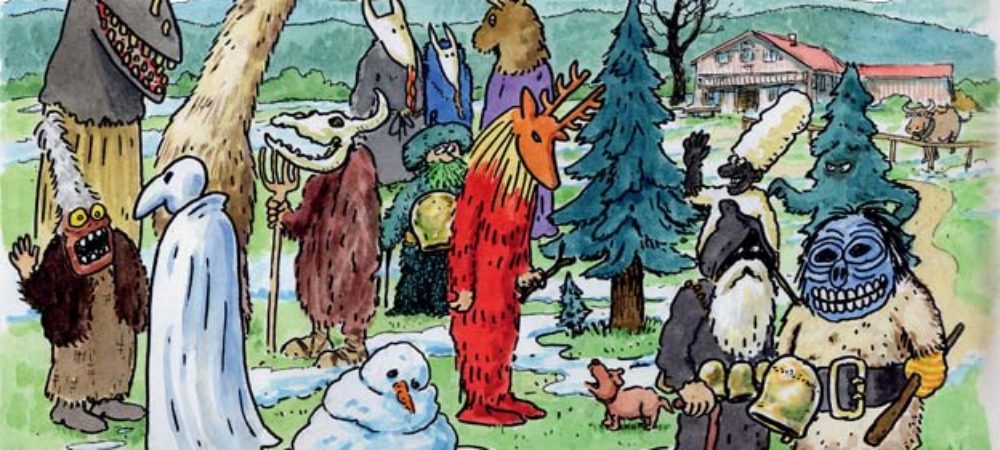 Diese Männer haben sich verkleidet, um die bösen Geister des Winters zu vertreiben. Sie erwecken den Frühling mit lauten Schellen. Pass auf, dass du keine Tanne mit einem Monster verwechselst!